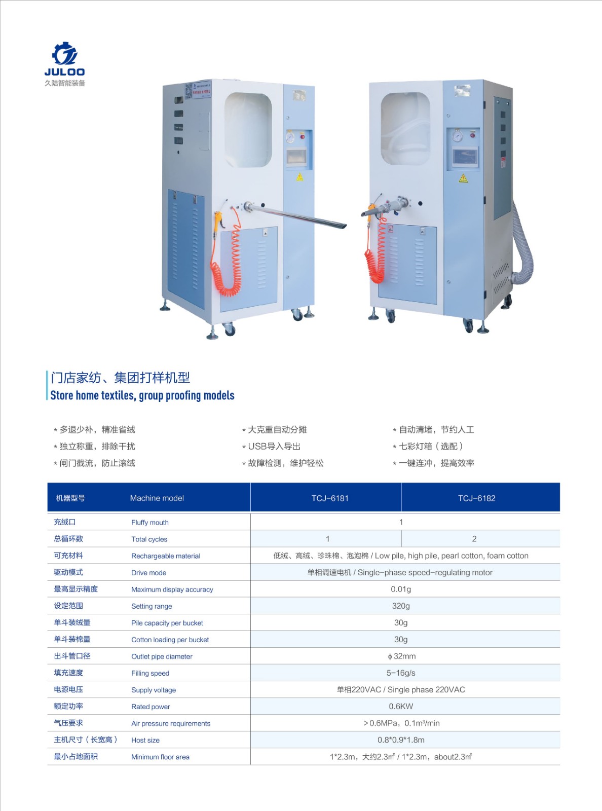 * 多退少補,精準(zhǔn)省絨* 大克重自動分?jǐn)? 自動清堵,節(jié)約人工* 獨立稱重,排除干擾* USB導(dǎo)入導(dǎo)出* 七彩燈箱(選配)* 閘門截流,防止?jié)L絨* 故障檢測,維護輕松* 一鍵連沖,提高效率