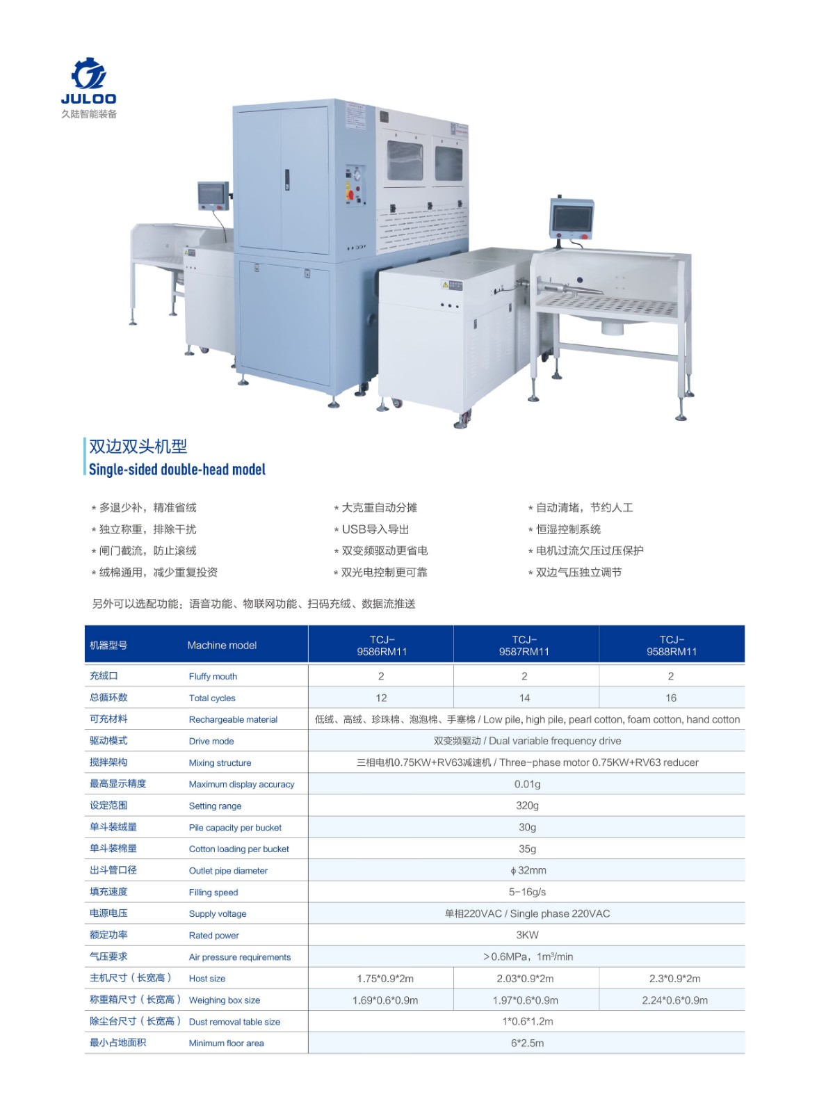 * 多退少補,精準(zhǔn)省絨* 大克重自動分?jǐn)? 自動清堵,節(jié)約人工* 獨立稱重,排除干擾* USB導(dǎo)入導(dǎo)出* 恒濕控制系統(tǒng)* 閘門截流,防止?jié)L絨* 雙變頻驅(qū)動更省電* 電機過流欠壓過壓保護* 絨棉通用,減少重復(fù)投資 * 雙光電控制更可靠* 雙邊氣壓獨立調(diào)節(jié)另外可以選配功能:語音功能、物聯(lián)網(wǎng)功能、掃碼充絨、數(shù)據(jù)流推送
