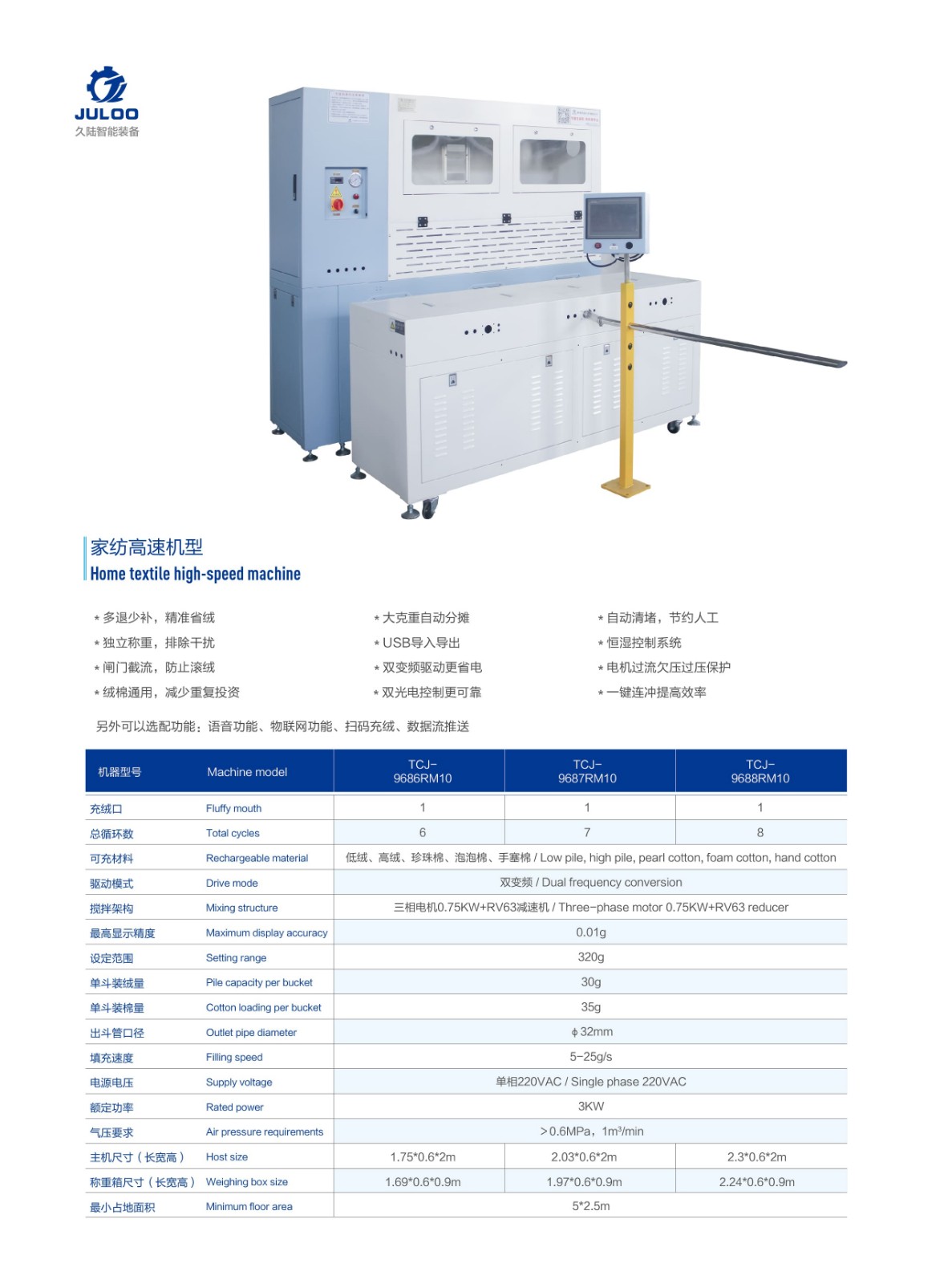 * 多退少補,精準省絨 * 大克重自動分攤 * 自動清堵,節(jié)約人工 * 獨立稱重,排除干擾 * USB導(dǎo)入導(dǎo)出 * 恒濕控制系統(tǒng) * 閘門截流,防止?jié)L絨 * 雙變頻驅(qū)動更省電 * 電機過流欠壓過壓保護 * 絨棉通用,減少重復(fù)投資 * 雙光電控制更可靠 * 一鍵連沖提高效率 另外可以選配功能:語音功能、物聯(lián)網(wǎng)功能、掃碼充絨、數(shù)據(jù)流推送